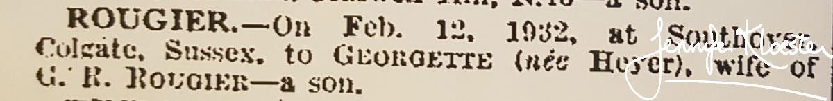 It took Georgette a little while to decide on the ideal title for the new book and she told Moore of several semi-humorous ideas for it, including The Son of the Duke, Wolf of Avon and an ironic suggestion from her brother Boris, who suggested calling it These Old Shadows. In the end she chose Devil’s Cub as one which would appeal to readers generally while conveying to those in the know that this was a book about the son of ‘Satanas’, her much-loved hero, the Duke of Avon. Heyer originally planned to finish the book in time for spring publication but did not complete it as hoped and so Devil’s Cub did not appear until November 1932. The delay in publication was hardly surprising, for in February she became a mother. Richard George Rougier was born at 3.40 on 12 February 1932 weighing eight pounds. Georgette and Ronald proudly announced his arrival in The Times and she soon learned to adjust her writing life around his needs, often sitting up all night to write. Two months after his birth on 21 April 1932, Richard was christened by the Reverend Arthur Maister at the local parish church of Colgate St Saviour. Several of Ronald’s and Georgette’s friends and family attended the service and Joanna Cannan (Pullein-Thompson), Dr Charles E. Harris: ‘the child-specialist’, and Boris were each named as godparents.
