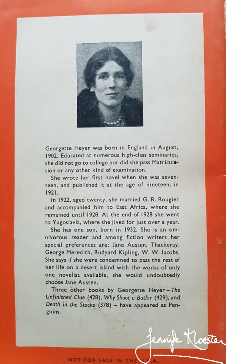 Georgette Heyer’s bio (with errors) on the back of the Penguin edition