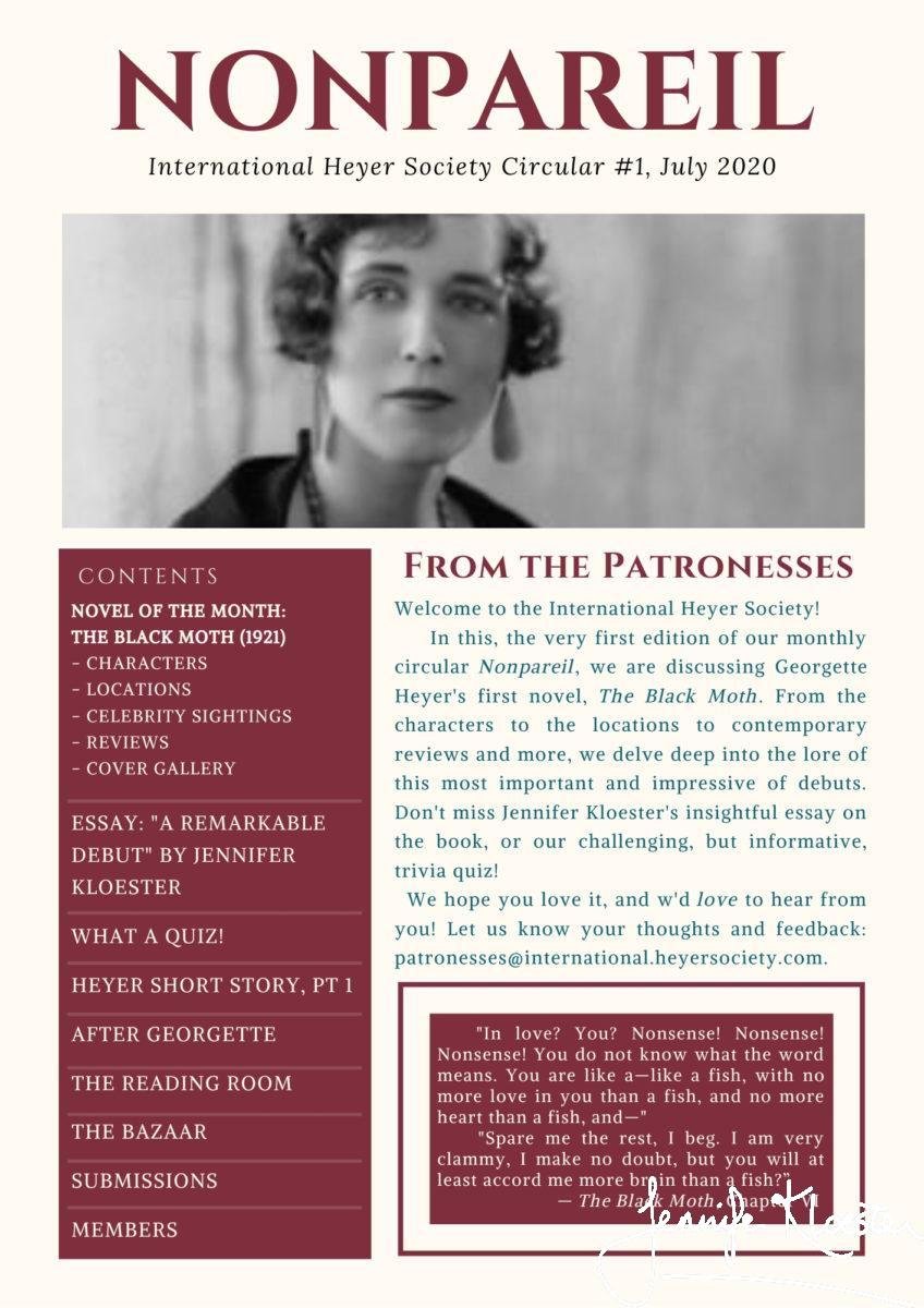 It is such a delight to announce the launch today, July 1st 2020, of the International Heyer Society and, in conjunction with my fellow Patronesses, Rachel Hyland and Susannah Fullerton, invite you to join us in sharing the joys of Georgette Heyer. September 2021 marks one hundred years since the publication of Georgette Heyer’s first novel, The Black Moth, written when she was just seventeen. As we look forward to celebrating her centenary in London, New York, Melbourne and Auckland (Covid-19 permitting), we will keep you well informed about the inimitable Georgette with our monthly circular, Nonpareil, in which we discuss her works in detail, along with weekly communications, quarterly digital talks and Q&As with Heyer experts, plus other membership bonuses. It doesn’t cost much to join the International Heyer Society and we look forward to meeting many of her fans as well as lots of new readers online.