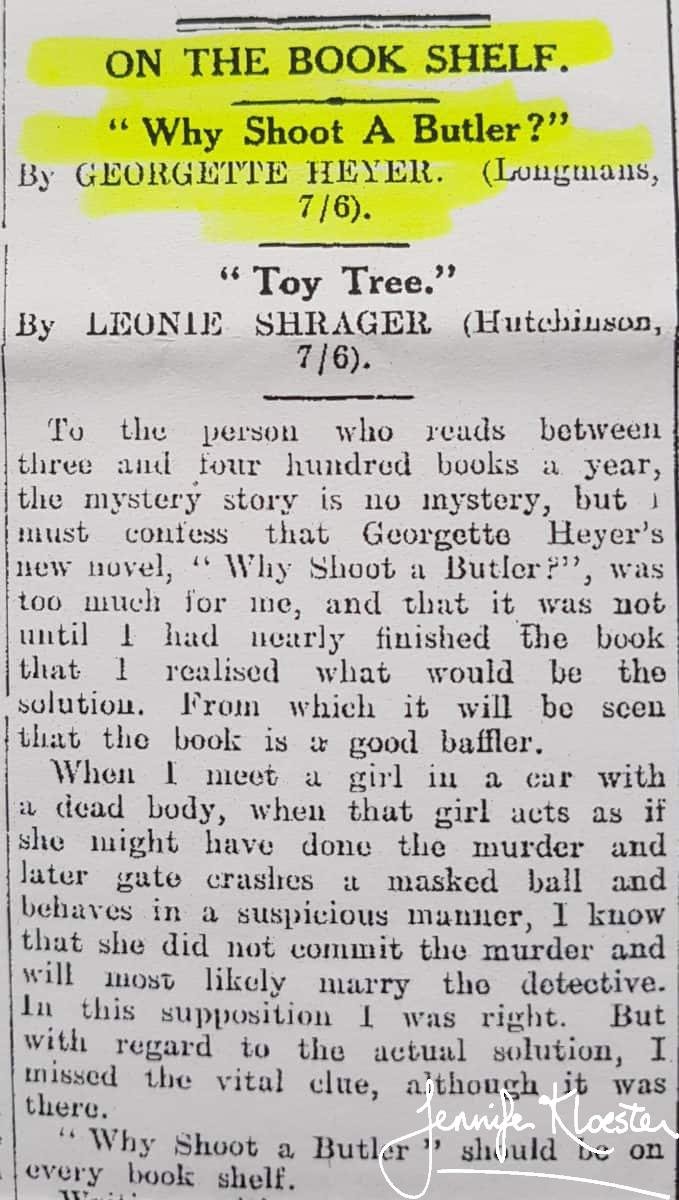Why Shoot a Butler? also featured a real house which Georgette had known of as a child. Her Aunt Inez used to stay with her in-laws at Norton Manor, a grand Victorian house in the deliciously named Norton Fitzwarren near Taunton in Somerset and Georgette had used it as a setting for her second murder mystery. Throughout her fifty-year career she would often use familiar locations such as inns and villages in Sussex or places she had visited and sometimes, such as when she had a character live in Albany, in places she had lived. Norton Manor, however, is one of the rare places which she knew first-hand and actually used as the main, rather than a minor, setting for one of her novels. It is a fascinating connection. Georgette’s own view of Why Shoot a Butler? is not entirely clear, but in a letter to her agent she wrote in typically self-deprecating (and very funny) style about a review she had read in a London paper. She erroneously named it the Westminster Record – perhaps confusing it with the Westminster Gazette in which her father, George Heyer, had occasionally had some of his poetry published. The original review clearly amused Georgette:
